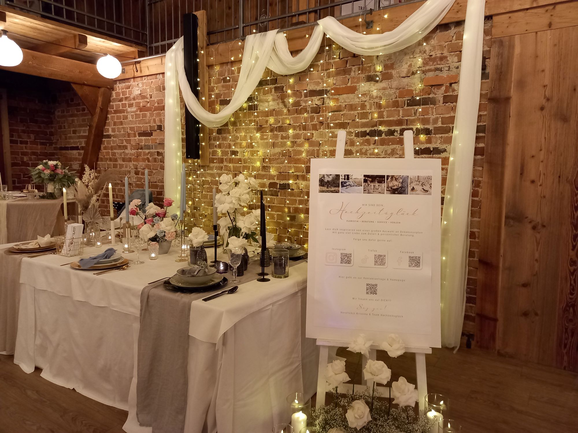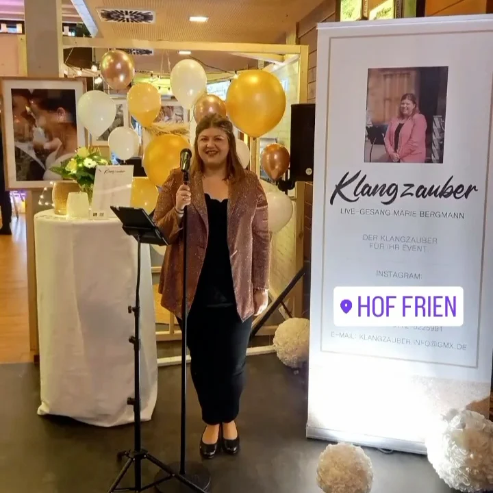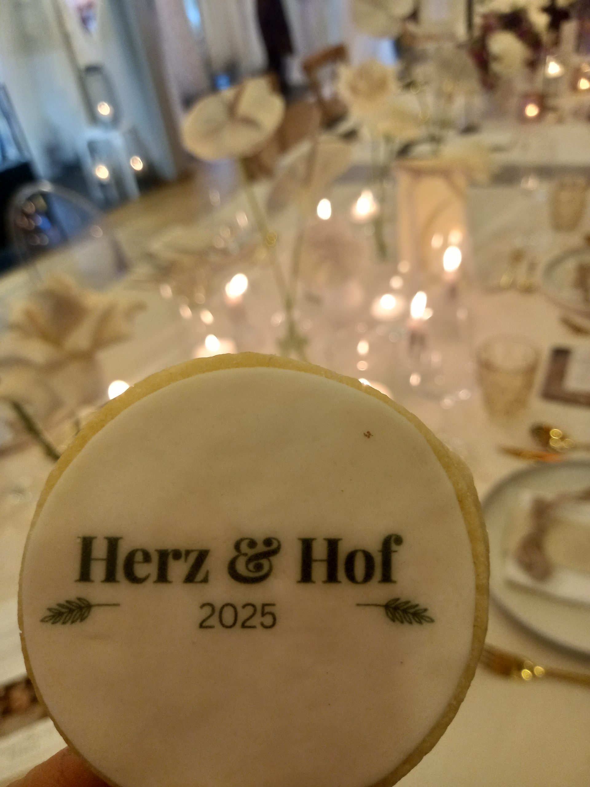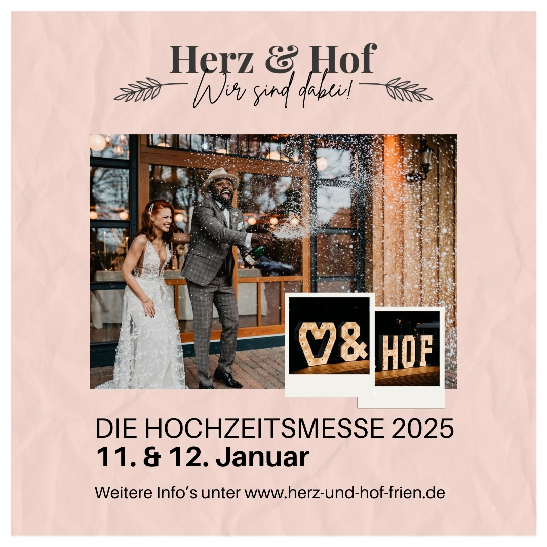 Ich stand zwei Tage auf der Messe: im Fest­saal mit so tollen, vielfälti­gen und vor allem beson­deren Ausstellern. Die Atmo­sphäre war wirk­lich beson­ders und ich kann allen Inter­essierten nur ans Herz leg­en im näch­sten Jahr vor­beizukom­men. Die Herz & Hof 2026 ist bere­its in Pla­nung und ich bin wieder dabei! Was ihr 2025 dort sehen kon­ntet: Trau­red­ner­In­nen, Vio­lin­is­ten, Foto- und VideografenIn­nen, Braut­straußkon­servierung, Braut­mode, Trau­ringe, diverse Spe­cials fürs Wed­ding-Enter­tain­ment, Torte & Kekse, DJs…so so viel! Und natür­lich das liebenswerte Team Hof Frien. Es war ein­fach super schön und ich freue mich sehr über die vie­len tollen Gespräche die ich führen kon­nte und über die Buchun­gen! Vie­len Dank an dieser Stelle an meine kün­fti­gen Braut­paare. Ich bin abso­lut hap­py, dass ich ein Teil eures großen Tags sein darf.